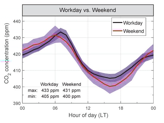 3.2. Diurnal Cycle on Workdays versus Weekends