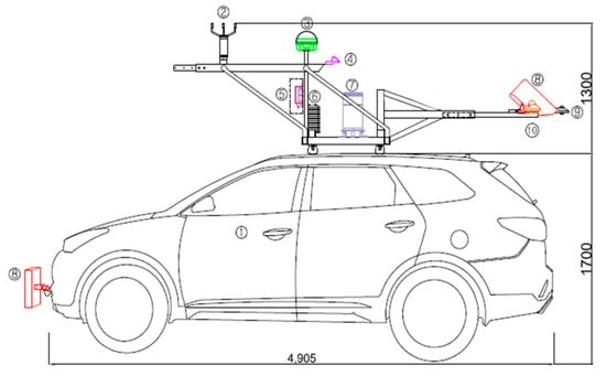 Detailed schematic diagram of the Mobile Observation Vehicle (MOVE) equipped with road weather and meteorological sensors (obtained from Kim et al., 2019 [9]).