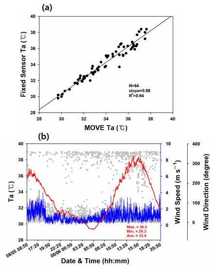 To confirm the quality of the MOVE data and to ascertain the data accuracy of the fixed sites, we used air temperature data from 2 fixed complex weather sensors (Hankook University of Foreign Studies, HUFS) installed at points R2 and R3 (Figure 1) during the observation period of the MOVE. MOVE data were collected for 17 (32 cycles) repetitive observations from 1451 local standard time (LST), 5 August to 2059 LST, 6 August (Table 3). Considering that validation time does not always coincide with the temporal resolution (1 min) of 2 fixed weather sensors, we retrieved a 1-min interval for MOVE data, and air temperature values from MOVE within a radius of 20 m of fixed sites were extracted. We compared air temperature values from MOVE with those of 2 fixed weather sensors. A scatter plot for the 32 cycles is shown in Figure 4a. As a result, the linear relationship (slope = 0.98) and coefficient of determination (R2 = 0.94) show good agreement, although the mean bias (−0.36 °C) tended to be slightly negative. These results demonstrated that the accuracy of air temperature data from MOVE is quite reliable under moving conditions on urban streets. However, validation of road surface temperature (RST) on a MOVE platform was difficult, because there were no road weather information system (RWIS) sites in the study area.