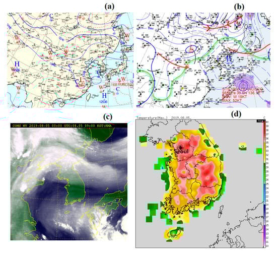 (a) 200 hPa and (b) surface weather chart, and (c) Communication, Oceanic and Meteorological Satellite (COMS) water vapor image at 0000 UTC, and (d) spatial distribution of daily maximum air temperatures on 5 August 2019.