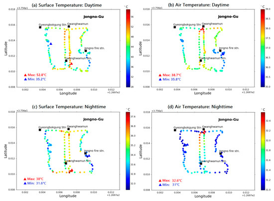 Spatial distributions of road surface temperature (RST) and air temperature from MOVE observations during the (a,b) daytime (1547–1602 LST) and (c,d) nighttime (2047–2114 LST) on 6 August, 2019. The color bars represent different temperature ranges.
