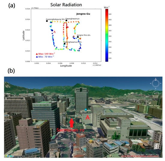 (a) Spatial distribution of solar radiation from MOVE observation during the daytime (1547–1602 LST) on 6 August, 2019, and (b) a 3D map view in the section of Saemunan-ro 5-gil from Vworld web service.