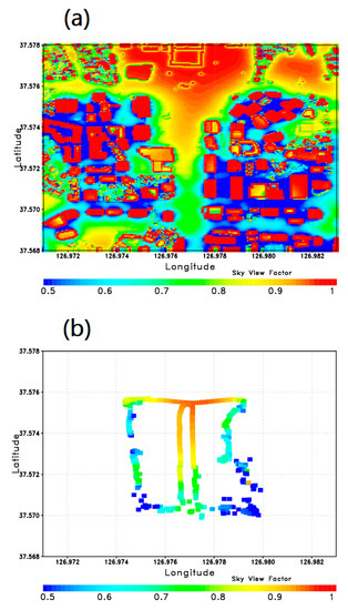 Sky view factor (SVF) distributions retrieved from digital surface model (DSM) (a) in the study area and (b) on the observation route of MOVE.