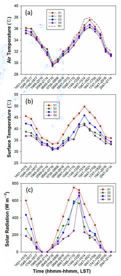As indicated, there was a tropical night phenomenon where the air temperature remained above 25 °C even at night during the BBMEX campaign. Therefore, we also examined the distributions of RST and air temperature at nighttime. Figure 6c shows the spatial distribution of RST at nighttime (from 2047 to 2114 LST) on the same day. Here, we detected abrupt change in RST distribution especially in S2 and S4, which is susceptible to signal loss (error in position estimation) due to obstructions around the road such as a high-rise building, a roadside tree, or other features [35]. The signature of the RST field at nighttime exhibited a result similar to that of the spatial distribution of RST at daytime (Figure 6a,c), which means that the differential heating on the road surface according to the section was maintained continuously until nighttime. However, the temperature range of nighttime RST was reduced by about 11 °C (36%) compared to that of daytime due to the blocking of the surface heating by the sun. In addition, the RST showed a tendency that the east–west section was higher than the south–north section, except for Sejong-daero in S1. On the other hand, we found that the differences between maximum and minimum air temperatures at nighttime were reduced to within 1.6 °C (Figure 6d), which is thought to be associated with lower ambient air temperature than the RST due to nighttime radiative cooling. It is interesting to note that the distribution of air temperature on Sejong-daero was about 1 °C higher at the same observation time. In the end, we suggest that the urban street width and sky openness contributes significantly to the magnitude of RST and air temperature for the whole day.