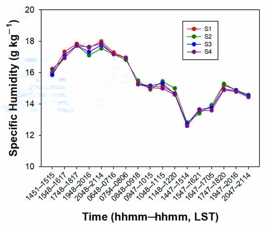 In S4, the lowest RST and air temperature are observed on the diurnal variation, which is shown in Figure 10 (also Table 4 and Table 5). To identify the relationships between those temperatures and specific humidity on diurnal variations, we used the further dataset of air pressure and relative humidity observed from MOVE. As mentioned previously, specific humidity can be calculated using the above variables, which is a useful indicator, because the rate of evapotranspiration of water from any surface is directly proportional to their difference between the surface and the adjoining air. Figure 12 shows the diurnal variation of averaged specific humidity calculated at each section. As a result, specific humidity remained high (greater than 16 g kg−1) in the early period, and starting from 0754–0806 LST on 6 August, it rapidly decreased until 1447–1514 LST (less than 13 g kg−1) and then gradually restored again to 15 g kg−1. These patterns are correlated with the diurnal variation of RST with a tendency to be out of phase. When the RST is the highest (1447–1514 LST), it can be seen that the specific humidity decreases rapidly down to 12.6 g kg−1, whereby it is likely that the increasing RST may have contributed to the humidity changes, especially on the urban streets mostly covered by asphalt (97%). Additionally, low humidity is not good at absorbing in the near-infrared part of solar radiation, which increases the amount of daytime energy reaching the surface with negative feedback. However, there were no significant differences in specific humidity between S4 and the other sections (Figure 12). It should be pointed out that the tree shading effect in S4 should depend more on the changes of RST and air temperature than the evaporative cooling effect, because the above specific humidity is not a dominant factor in S4, probably due to the fact that insufficient street trees and dryness of soil moisture may have weakened lowering RST and ambient air temperature through evapotranspiration.