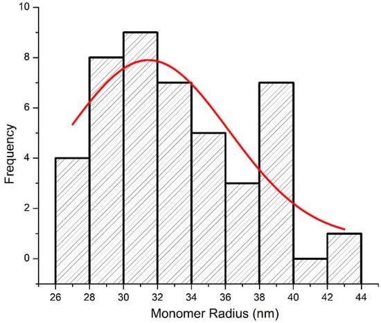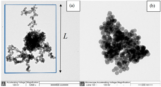 The quantity, L, is easily measurable, and, once obtained, the overall size of the aggregate can be found from Equation (10). In determining L from the image, three measurements were done, and the software (ImageJ) was recalibrated each time. The average value of L is what is reported here. With , , a, and determined, the number of monomers, , in the aggregate is estimated through Equation (1); the results of which areratjion listed in Table 1.