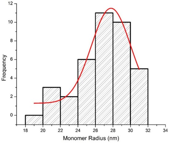In this work, the size distribution was obtained from the TEM images of BB aerosol collected on filters following combustion. From the projected area of the primary particles, the average monomer diameter was measured to be 55.6 nm by measuring the diameter of several selected distinguishable particles. A histogram of monomeric particle radii (not diameters) is shown in Figure 2 for eucalyptus, along with a Gaussian fit that has a standard deviation of 2.9 nm. The primary particle diameters in flame-generated agglomerates have been shown to follow a normal distribution [71] as displayed in Figures 2 and 5. The TEM analysis of primary particle radius of aggregates from the combustion of eucalyptus is shown in Figure 1. The mean diameter obtained is well within 50 ± 10 nm for the scanning electron microscopy (SEM) image of the freshly emitted biomass aerosol as reported by Manfred et al. [12]. This size distribution leads to a size parameter, xp, in the range of 0.30 ≤ ≤ 0.34 for measurements performed at wavelengths between 500 and 580 nm.