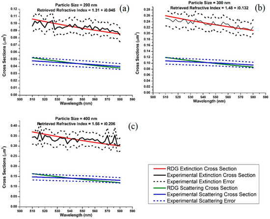 Comparison of measured and calculated cross sections for eucalyptus fuel, for (a) 200, (b) 300, and (c) 400 nm sized particles.