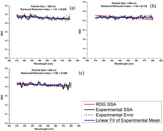 The resulting fits for cross sections are presented in Figure 3a–c for mobility diameters of 200, 300, and 400 nm, respectively. Refractive indices were found to be 1.31 + i0.045, 1.48 + i0.132, and 1.56 + i0.206 for the same respective sizes, as shown in Table 2. While fits were generally good, we were unable to reproduce the observed wavelength dependence with any RI. This is likely due to a small wavelength dependence of the real portion of the RI. The mean SSA obtained from the RDG fitting to the experimental values and their standard deviations were 0.47 ± 0.01, 0.44 ± 0.01, and 0.42 ± 0.01 for the same respective sizes. These closely match the experimental averages shown in Table 2. Figure 4 shows the observed and derived SSA values from the models as a function of wavelength. While almost no wavelength dependence is observed experimentally, SSA values resulting from fit refractive indices show a slight wavelength dependence, which decreases more quickly with wavelength. This is also likely the result of a small wavelength dependence of the real portion of the RI.