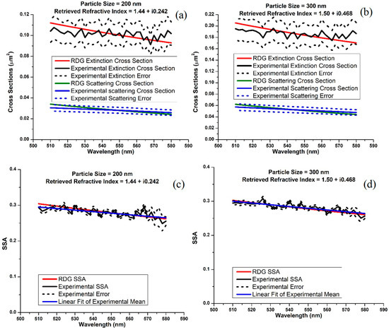 where is the error in the individual measurement, is the number of wavelengths, Cext,exp is the experimental extinction cross section, Cext,calc is the calculated extinction cross section, Csca,exp is the experimentally measured scattering cross section, and Csca,calc is the calculated scattering cross section. This retrieval method is appropriate for monodispersed aerosol particles whose refractive index does not vary strongly with wavelength over the selected wavelength region [77].