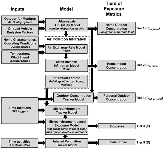 The EMI predicts multiple tiers of individual-level exposure metrics for actual participants in epidemiological studies using outdoor concentrations, questionnaires, weather, and time-activity information [11]. We previously developed and applied EMI for an epidemiological study called the Diabetes and the Environment Panel Study (DEPS) [11,12]. In the DEPS, we used a residential air exchange rate (AER) model, building infiltration model, and microenvironment-based exposure model to predict residential indoor concentrations and personal exposures for ambient PM2.5.