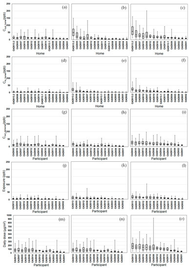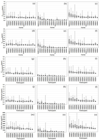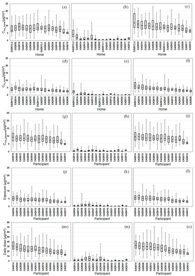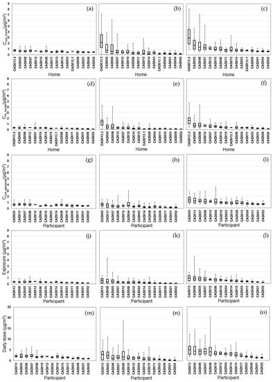 We compared the variability of daily D and time spent in each ME (Figure 6 and Figures S1–S4). For all participants, the highest median dose and greatest time spent was indoors at home. For the other six MEs, the ME with greater time spent usually corresponded to higher median dose for most participants. For CO, this was always the case. For PM2.5, EC, and NOx and for a few participants, the three indoor MEs (work, other, in-vehicles) with greater time spent corresponded to lower median doses as compared to the three outdoor MEs (home, work, other). This is likely due to the indoor and in-vehicle attenuation of ambient PM2.5, EC, and NOx, whereas ambient CO has no indoor or in-vehicle attenuation [26,27,28]. Also, the daily physical activity levels had substantial temporal and participant-to-participant variability for daily time spent performing at low intensity levels (e.g., walking) with an overall range of 20–390 min/day (Figure S5).