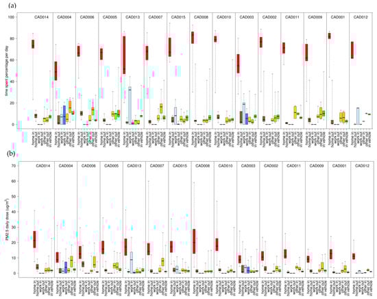 Percentage of daily time spent in (a) and inhaled dose for total PM2.5 (b) for each microenvironment (indoors and outdoors at home, work, and other; inside vehicle) and each participant. Results (24 h average, 08:00–08:00) are sorted by median values of the total dose from highest to lowest. Shown are medians with 25th and 75th percentiles, and whiskers for minimum and maximum values.