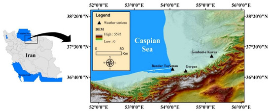 Golestan province is located in the southeastern part of the Caspian Sea with an area of 20,387 km2 and covers about 1.3% of the total area of Iran (Figure 1). This province has an average annual rainfall of 450 mm in the geographical range of 36°25′ to 38°8′ north latitude and 53°50′ to 56°18′ east longitude. The geographical location and topography of Golestan province influenced by various climatic factors and different climates observed in this province. So that, the semi-arid climate is observed in the international border and the Atrak basin, moderate and semi-humid in the southern and western parts of the province, as well as cold climate in the mountainous regions.