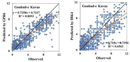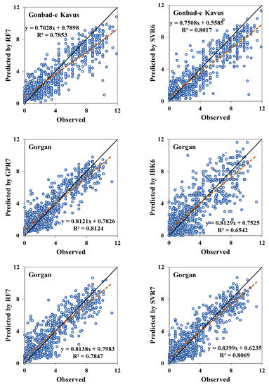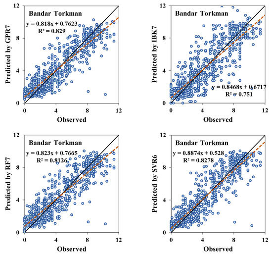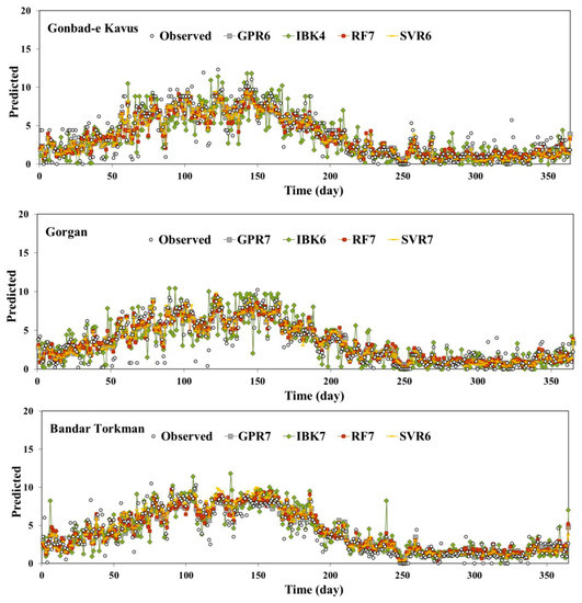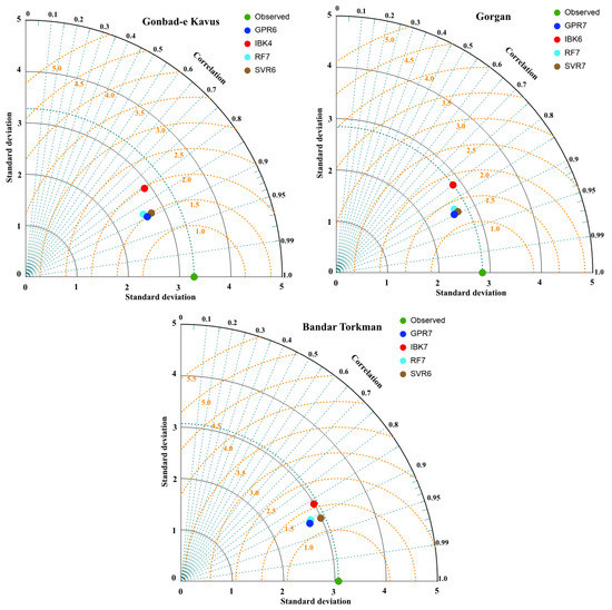 It can be comprehended from Figure 2 that the estimations of GPR6 at Gonbad-e Kavus station and GPR7 at both Gorgan and Bandar Torkman stations are in better agreement with observed PE. Similarly, it indicates from Figure 3 that the estimates of GPR6 and GPR7 are less scattered through the bisection line, and they preferred in correspondent stations. Moreover, an individual assessment of observed and estimated PE values by the best GPR, IBK, RF, and SVR models accomplished for each studied stations (Figure 4). Taylor diagrams, presented in Figure 4, are practical tools for better understanding the different potential of studied models. In the Taylor diagram, the most accurate model is explained by the point with the lower RMSE and higher R values. So, the Taylor diagrams proved that GPR6 in Gonbad-e Kavus and GPR7 in both Gorgan and Bandar Torkman stations indicated the best performances and presented the most accurate predictions of PE.