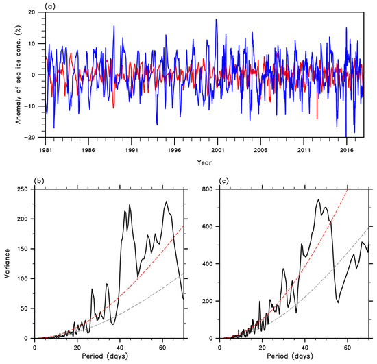 (a) Wintertime (December–February) daily time series of sea ice concentration anomalies in the Bering Sea (red) and the Sea of Okhotsk (blue) from 1981 to 2017. Hereafter, 1981 denotes the December–January–February (DJF) of 1981 from 1 December 1981 to last day of February 1982 as an example. (b) and (c) indicate the power spectrum (black solid), red noise curve (gray dashed), and 95% confidence bounds (red dashed) for the Bering Sea and the Sea of Okhotsk, respectively.