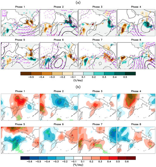 Our study is advanced from [12] in the following two aspects. Differently to [12], we considered the time lag of the influence of the MJO on the North Pacific teleconnection and brought the dipole sea ice modulation by the MJO over the North Pacific into focus. Taking the time lag into consideration, the intraseasonal SIC changes at the peak phases (i.e., 3 and 7) seem to be more dependent on wind-driven sea ice drift rather than temperature anomalies, because there is no promoting effect on the significant changes in ∆SIC by temperature anomalies in phases 3 and 7. Yet, as in [12], the temperature anomalies still seem to affect phases 2 and 6.
