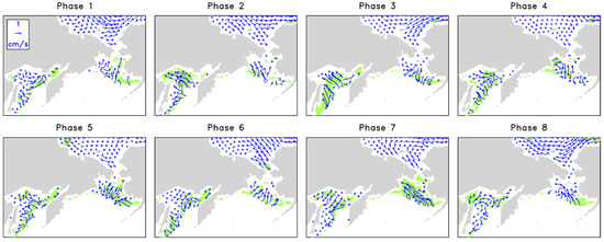 Seven-day mean anomaly composites of sea ice motion from day 4 to 10 after each MJO phase peak. The composites over the green shaded regions are statistically significant at the 90% confidence level based on a Student’s t-test.In phases 6 and 7, anomalous northeasterly and southeasterly winds prevail in the Sea of Okhotsk and the Bering Sea, respectively (Figure 2a). Similarly, the southwestward wind-driven transport due to northeasterly wind extends sea ice in the Sea of Okhotsk (Figure 3). The northwestward wind-driven transport, due to southeasterly winds, leads sea ice to be contracted to the north so that sea ice retreats in the basin (Figure 3). Air temperature is not the main factor in the SIC variations in phases 6 and 7, although warm advection may affect the decrease in SIC in the Bering Sea in phase 6. According to our results, the dipole pattern in sea ice between the Bering Sea and the Sea of Okhotsk is evident in phases 2–4 and phases 6–7. Because of their similarity of mechanism to control sea ice change, i.e., wind-driven transport, we will hereafter focus more on phases 3 and 7 of the MJO for a simpler approach. In addition, the MJO-induced teleconnection patterns are not so different within each phase group, i.e., phases 2–4 and phases 6–7 (not shown).