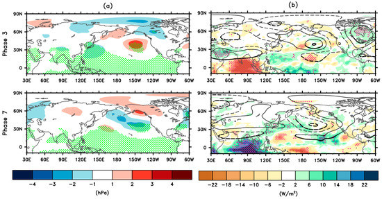 The 10 m wind field strongly depends on the SLP pattern over the North Pacific. In SLP composites, the eastward tilted dipole patterns are evident between the North Pacific and Alaska in both phases 3 and 7 (Figure 4a). In phase 3, an anomalous high and low are located in the North Pacific and Alaska, respectively. The opposite is true for phase 7. These SLP patterns exactly correspond to the 10 m wind vectors shown in Figure 2. Since we hypothesized herein that the SLP patterns are attributable to the planetary Rossby waves being stimulated by MJO-related tropical convection, the 300 hPa eddy geopotential height fields were also investigated. As can be seen in Figure 4b, in the upper-level troposphere, the planetary Rossby waves are clearly displayed. Enhanced tropical convection over the Indian Ocean (in phase 3) causes the negative PNA-like pattern, while that over the central Pacific (in phase 7) creates a positive PNA-like pattern. In fact, several studies have suggested that active (inactive) convection in the Indian Ocean and the western Pacific is likely related to the negative (positive) PNA pattern [14,23]. According to our results, the upper-level eddy geopotential height nearly corresponds to the SLP pattern. These strong barotropic structures in both phases strongly support the idea that the SLP pattern is modulated by the planetary Rossby waves stimulated by the MJO-related tropical heating.