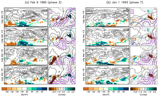 Anomalies of the atmospheric variables and ∆SIC (a) on 6 February 1985 for phase 3 and (b) on 1 January 1993 for phase 7. Shading indicates the tropical OLR (∆SIC), and the contour is the eddy Z300 (SLP) in the left (right) panels. Arrows in the right panels are 10 m wind vectors with wind speeds above 5 m/s. The interval of the 300 hPa geopotential height (SLP) anomaly is 100 m (7 hPa) from ±50 m (±7 hPa), and dashed lines represent the negative anomaly.