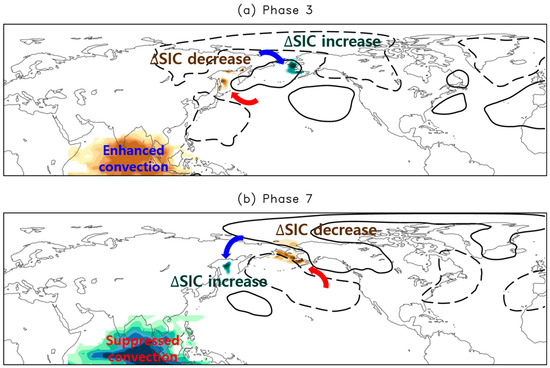 A remote response of the Arctic to the tropics has also been investigated in terms of El Niño–Southern Oscillation (ENSO) and the Madden–Julian Oscillation (MJO). The Arctic warming is accelerated during the period of a La Niña-like tropical convection pattern via the upward and poleward propagation of Rossby waves [8,9]. Similarly, on an intraseasonal timescale, the dominant intraseasonal mode of tropical convection, the MJO [10], has been found to contribute to Arctic warming [11] and sea ice [12], where the poleward-propagating Rossby waves are attributed to those remote connections [13]. Henderson et al. [12] studied the Arctic sea ice modulation by the MJO in winter and summer and found that the winter (January) SIC variability in the Atlantic (Pacific) sector showed a mirror-like pattern between MJO phases 4 and 7 (2 and 6), indicating an MJO phase-dependent modulation.