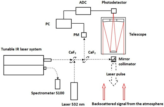 The universal scheme of the OPO lidar system developed (Figure 1) is used in field atmospheric measurements. During the measurements in the atmosphere, a part of laser radiation reflected by CaF2 plate is used to measure the transmitted pulse energy in the experimental setup. A visible laser at 532 nm is used to align the invisible IR radiation to maintain the trans-receiver axes. Further, the wavelength of the laser radiation is measured using spectrometer S100 as shown in Figure 1. Photodetector records a backscattered signal from the atmosphere collected by the receiving telescope Cassegrain.