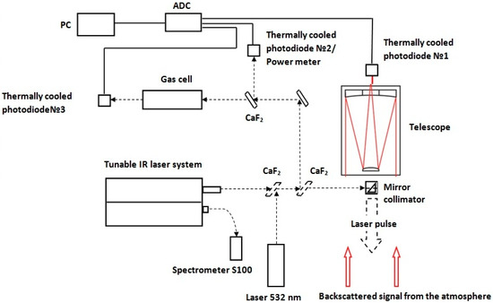 To calibrate the lidar system and measure the absorption coefficients at the selected informative sounding wavelengths, the scheme in Figure 1 was used. A calibration gas cell to the scheme was added. The optical scheme of the experiments is shown in Figure 4.