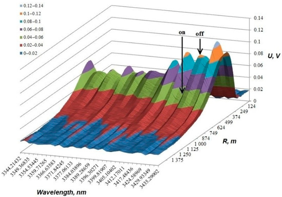 Figure 7 shows the tuning curve of the atmospheric response, the spectral range of which includes informative methane absorption lines, for example, 3.39 μm (U is the voltage of the backscattered signal at the photodiode detector, V; R is the atmospheric path, m).