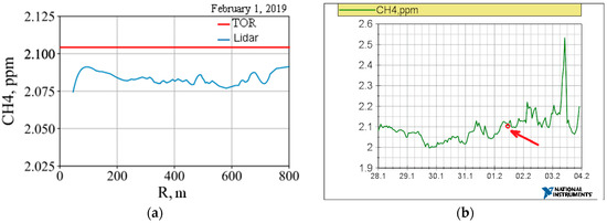 The background concentration of methane was calculated using the equation shown in Equation (2). The path averaged methane concentration of about 2.085 ppm over the path length of 800 m was retrieved. The measurement results were compared (Figure 10b) with the data from the TOR (tropospheric ozone research) station of the IAO SB RAS [35,36], where the methane concentration is around-the-clock measured. The OPO lidar and the TOR station are located in the same building. The error level of methane concentration recovery correspond to 8–13% relative to the averaged value.