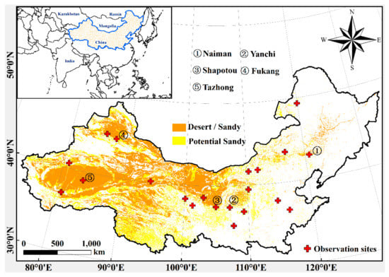 Northern China’s sandy areas consist of several regions, including a transitional zone of desert wilderness; the deserts of Guerbantunggurt, Taklimakan, Qaidam Kumtag, Badain Jaran, Tengger, Ulanbuh, and Kubuqi; and the sandy lands of Mu Us, Otindag, Horqin, Hulun Buir, and Qinghai Gonghe. The SAONC are among the most densely populated areas within the semiarid and arid climatic zones, which are characterized as highly sensitive and vulnerable []. Despite substantial reductions in desertification land over the past decade, the net increase has remained high compared with that in the 1950s because of the two regions of the Tengger Desert [].