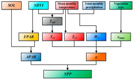 Potter et al. [] and Field et al. [] first developed the CASA model based on the light-use efficiency (LUE) model (Figure 2). The version modified by Zhu et al. [] was used in the present study. The CASA model incorporates the product of photosynthetic available radiation absorbed by green vegetation (APAR) and the actual LUE (ε):