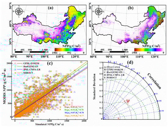 Simulation and validation of the CASA model; (a) represents the CASA simulation of the multi-annual change in mean net primary productivity (NPP); (b) represents a multi-annual NPP variation chart based on MODIS data (http://luna.ntsg.umt.edu/data); (c) is based on the CASA model simulation of different climate models of the correlation between the model data and MODIS data; and (d) is the Taylor diagram between the field monitoring data and the simulated data based on the flux observation site from CASA model.