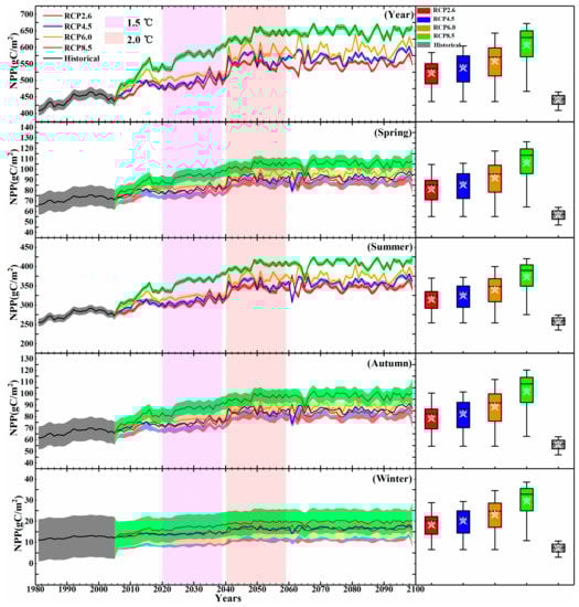Overall, the variation ranges of NPP in SAONC will occur mainly between 2017 and 2036 (465–518 g C/m2, except RCP8.5) and 2042 and 2100 (527–614 g C/m2, except RCP8.5). The fluctuations in NPP under the RCP8.5 scenario increased significantly; however, after 2052 the increase tended to be gradual (634–668 g C/m2·a). In the future, seasonal variations in NPP in SAONC will occur in spring and autumn (287–418 g C/m2·a), summer (69–104 g C/m2·a), and winter (11–19 g C/m2·a).