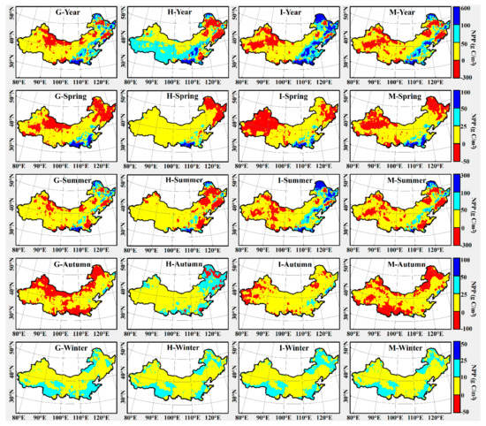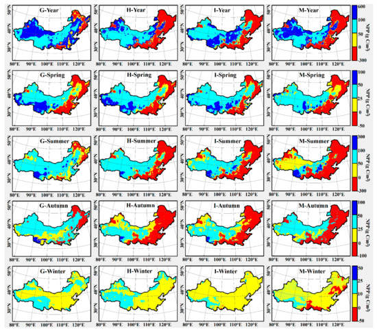 Spatial distribution of NPP changes under GW_1.5 °C for the whole year, spring (March, April, May), summer (June, July, August), autumn (September, October, November), and winter (December, January, February). Each letter represents a different climate model; G represents the GFDL-ESM2M model, H represents the HadGEM2-ES model, I represents the IPSL-CM5A-LR model, and M represents the MIROC5 model.