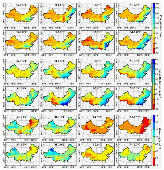 Spatial variation of precipitation, solar radiation and warming level in SAONC. Each letter represents a different climate model; G represents the GFDL-ESM2M model, H represents the HadGEM2-ES model, I represents the IPSL-CM5A-LR model, and M represents the MIROC5 model.