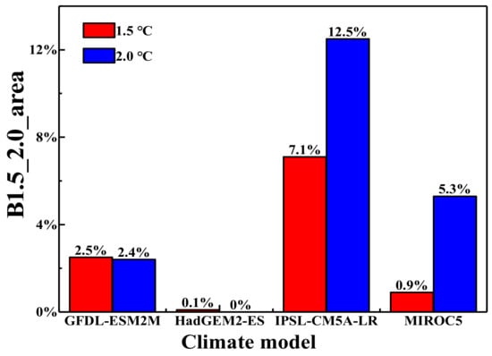 The percentages of areas where the temperature increase is below the global values of 1.5 and 2.0 °C (B1.5_2.0_area, Units: %).