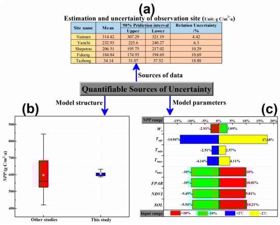 Analysis of uncertainty based on the CASA model. (a) the uncertainty based on observation site; (b) the results of this study were compared with other studies; (c) uncertainty of model parameters.