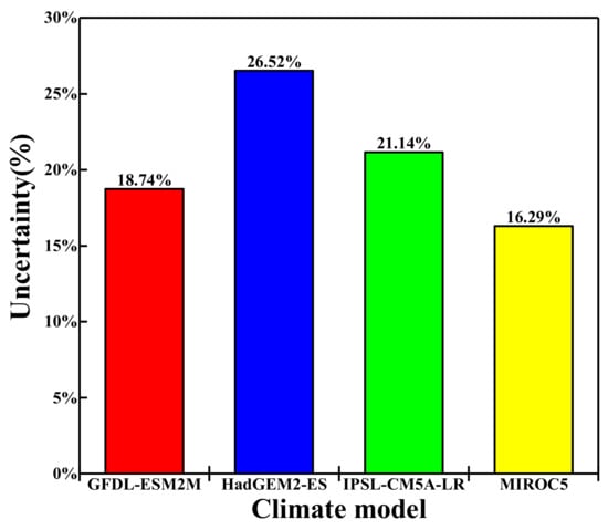 In the present study, the changes in NPP compared with the changes in RP in the future global warming scenarios were compared and analyzed by synthesizing the simulated results of four climate models. Although the present study improved the accuracy of the research results to some extent, it should be noted that large differences persist among the different model parameters. Based on the above results, an uncertainty analysis of NPP under the four models was implemented (Figure 10), and the values ranged from 16.29 to 26.52%. The uncertainty of the HadGEM2-ES model was the largest, and the uncertainty of the MIROC5 model was the smallest. These results are consistent with those obtained by Li, Lu, Zhang, Liu, Gao, and Ao [] and Fu et al. []. In fact, multiple studies have found large uncertainty associated with the NPP of the global terrestrial ecosystem. However, because of the lack of long-term global NPP data [,], the validation of modeled NPP values cannot be as rigorously implemented at regional and global scales as observed for validations of climatic simulations. In the present study, we utilized ChinaFlux data and MODIS NPP data to compare the NPP values of the ISI-MIP2b models, and the results highlighted the need to improve our knowledge of the factors governing variability within model estimations of NPP in sandy regions.
