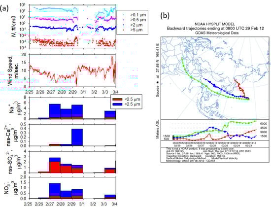 A dust event was observed on February 29, 2012, when the ship was at 27.68 N°, 169.41 E° during leg 2 of the KH-12-1 cruise en route from Honolulu to Tokyo (February 22–March 7, 2012), about 4000 km from the Asian continent. On-board LPC aerosol number concentration measurements (Figure 1) clearly showed that the coarse aerosol (D > 5 µm) concentration increased by one order of magnitude during the dust outflow event. In a high-wind condition, the generation of sea salt particles by wave-breaking might be enhanced and might contribute to an observed increase in coarse aerosols. However, the wind speed during the dust event was less than 10 m∙s−1. In addition, the concentration of particulate Na+ remained rather constant during February 27–29, but the non-sea-salt (nss)-Ca2+ concentration in the coarse aerosol abruptly increased on February 29. Therefore, the sudden increase in the coarse aerosol number concentrations observed on February 29 could be regarded as a dust event. The backward air mass trajectory analysis suggested that the air mass at 500 m a.s.l. encountered on February 29 originated from around Japan, whereas those at 1000 and 1500 m a.s.l. originated from the Asian continent and passed over the Taklamakan Desert region. Before the Asian dust outflow event on February 29, 2012, nss-SO42− and NO3− concentrations also remained high during February 27–29. NO3− is a good indicator of anthropogenic influence. One can infer that NO3− particles of >2.5 µm would be produced by the Cl− displacement of sea salt particles by HNO3. HNO3 tends to preferentially displace the Cl− of sea salt particles compared to SO2 because of the high uptake coefficient to sea salt []. In addition to anthropogenic influences, nss-SO42− is formed by the oxidation of dimethyl sulfide originated marine biota. The temporal change of total nss-SO42− in the period corresponded to that of NO3−, suggesting effects of Asian outflow. The temporal change of these concentrations was asynchronous with the increase of nss-Ca2+, suggesting that the dust event augmented the effects of the first event of the long-range transportation of anthropogenic Asian outflow. The long-range transportation of dust particles from the Asian continent followed on February 29, 2012.