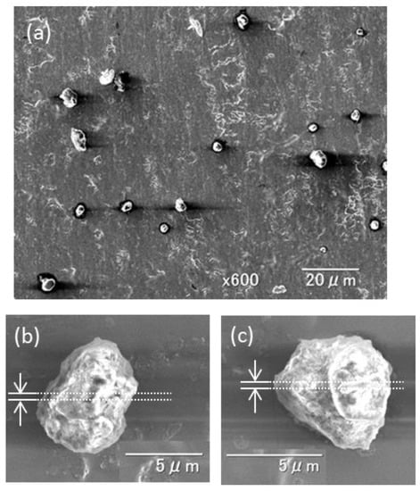 The SEM image shown in Figure 2a presents an example of the dust particles collected during the dust event. The image shows that coarse atmospheric particles with diameters larger than several micrometers were collected on the Ti plate. Most of the collected micrometer-size particles had a dust-like rough surface rather than a cubic-crystalline shape, which is typical of sea-salt particles. Among the dust-like micrometer-sized particles, two particles of the sample that were large were sliced and analyzed. The particles were designated as Dust Particle 1 and Dust Particle 2. They are shown, respectively, in Figure 2b,c. Each particle had a rough surface and dust-like shape. Their diameters were approximately 6 μm. An EDS elemental analysis showed that primary chemical components of the particles were Ca and Si, supporting the inference of Particles 1 and 2 as dust particles. Section 3.2 presents additional details. By FIB milling, thin sections (approximately 200 nm thickness) shown as broken white lines in Figure 2b,c, were prepared for additional detailed TEM analyses.