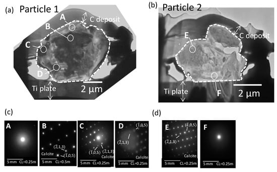 Figure 3a,b presents cross-sections of the Dust Particles 1 and 2 that were observed with TEM. The cross-sections of the particles are inside the broken white lines in the figure. Outside of the broken white lines are the Ti plate or the carbon deposit added during FIB processing. The TEM images clearly show that several domains existed with different contrasts. To examine their local crystalline structures, an SAED analysis was applied for the spots A–F. The obtained diffraction patterns are presented as Figure 3c,d. Spots B, C, and D in Dust Particle 1 and spot E in Dust Particle 2 show periodic patterns of bright spots, indicating their crystal structure. However, no periodic diffraction pattern was observed in spot A in Dust Particle 1 or in spot F in Dust Particle 2, suggesting that the two regions (A and F) were amorphous.