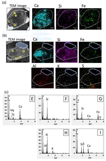 In Figure 4b, a TEM image and elemental mapping of Dust Particle 2 are presented, showing Ca, Si, Fe, Al, K, and S with EDS spectra for areas E–I. Unfortunately, the upper right part of Dust Particle 2 was lost during sample handling before the EDS analysis. Several Ca-rich domains were found, including spot E. Small peaks of Si and Mg was also detected with high-Ca from EDS spectra for spot E. The SAED patterns obtained from spot E also matched that of the calcite (zone axis [,,]) containing the forbidden reflections. Based on the analysis of EDS spectra, the molar ratio of Mg to Ca was 0.1 for spot E. These results support the idea that the area was composed mainly of calcite but contained a small amount of dolomite. Several Si-rich small domains without Ca were also found, including spot F. The SAED patterns of spot F suggested amorphous silica. In a Si-rich domain, including spot H, both Al and K were found to be abundant.