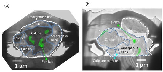 The present results demonstrate that the analyzed coarse dust particles that had been transported long distances from the western North Pacific were composed mainly of amorphous silica and calcite. The Fe was detected mainly inside the particles. Jeong and Nousiainen reported the characteristics of the internal structure of Asian dust particles that were collected in Korea, a country that is much closer to the dust source region than the dust sampling location that was used for this study while using a similar combined FIB thin-slice preparation and TEM analysis []. Their reports revealed that individual dust particles consisted of numerous mineral grains that were classifiable into internal structures of several types: single and polycrystalline cores of quartz, feldspars, calcite, and amphibole. They also found that iron oxide was distributed as submicrometer grains inside the main minerals, such as clay. Conny [] reported the elemental distributions of five atmospheric dust particles collected in Atlanta, Georgia, USA, using EDS with a FIB-SEM system. Results showed approximately 2 μm iron grains in the dust particles with diameters larger than 10 μm, and these particles were composed mainly of dolomite []. Most Fe-rich parts in this study were also grains smaller than 1 μm that were surrounded by amorphous silica and calcite. Actually, SiO2 and CaCO3 are, respectively, insoluble and poorly soluble in water. The Fe encapsulated by such compounds might not contribute to the enhancement of marine biological activity in oligotrophic oceans after deposition.