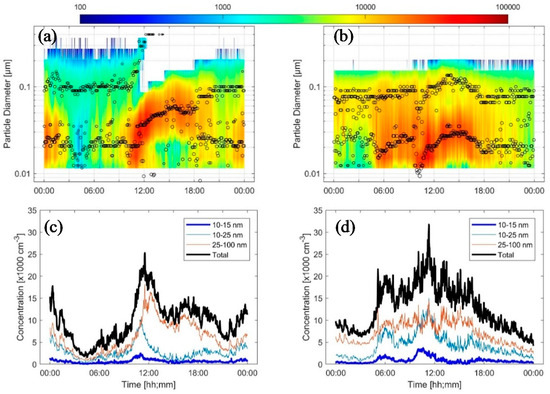 The PNSub also exhibited a diurnal pattern and weekly cycle with higher concentrations during workdays (Sunday–Thursday) than weekends (Friday and Saturday) (Figure 2a). These temporal variation characteristics resemble the influence of anthropogenic sources (mainly traffic) and were affected by local meteorological conditions (temperature, wind speed, and relative humidity). Based on the particle number concentrations, most of the submicron particles (about 93%) were within the ultrafine particle (UFP) diameter range (Dp < 0.1 µm).