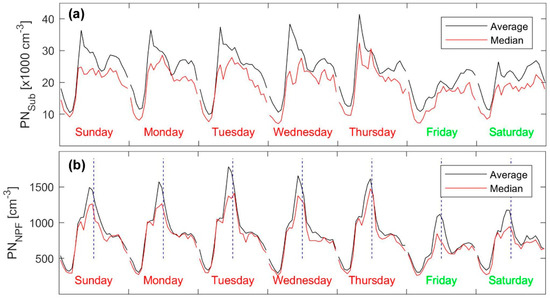 Overall diurnal pattern and weekly cycle of the (a) total submicron particle number concentration (PNSub) and (b) number concentration in the first channel (diameter 10–15 nm); the vertical dashed lines are aligned at noon time.