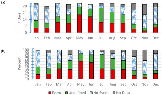 Occurrence of new particle formation events, non-event, undefined, and bad/missing data (i.e., no-data): (a) frequency and (b) monthly percentage.