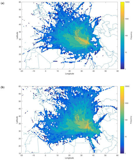 Back trajectories (96 h backward) crossing map during (a) new particle formation (NPF) events and (b) no-events days. The back trajectories were calculated for each hour at arrival height 100 m in Amman (measurement location). The color contour represents the back trajectories crossing frequency in each grid cell (resolution 0.5°).