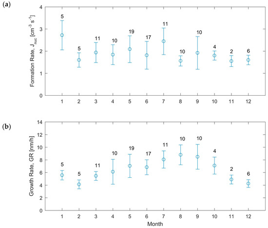 Yearly pattern of the (a) observed formation rate (J10) and (b) modal growth rate during NPF events. The bars represent the standard deviation and the number above represents the number of observations during that month.