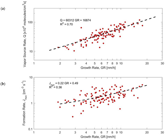 Correlation plots (a) condensable vapor source rate (Q) (daily means) versus modal growth rate (GR) during NPF events and (b) formation rate (J10) (daily means) versus growth rate (GR) during NPF events.
