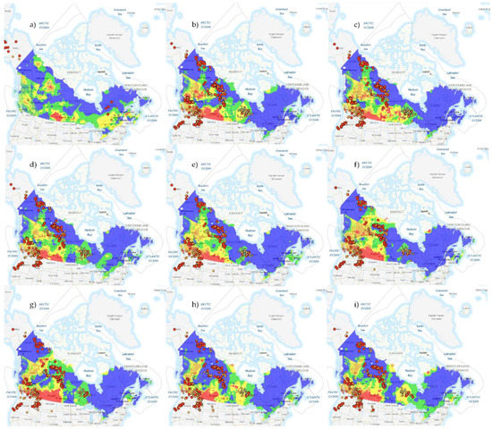 Daily active fire and fire danger hotspots provided by the Canadian Wildland Fire Information System based on the AVHRR, MODIS and VIIRS satellite observations for 13 June (a), 19 August (b), 20 August (c), 21 August (d), 22 August (e), 23 August (f), 24 August (g), 25 August (h), and 26 August (i) of 2017. Active Fires: 0 to 100 Ha (small yellow dots), 101 to 1000 Ha (medium orange dots), >1000 Ha (big red dots). Fire Danger: Low (blue areas), Moderate (green areas), High (yellow areas), Very High (orange areas), Extreme (red areas).